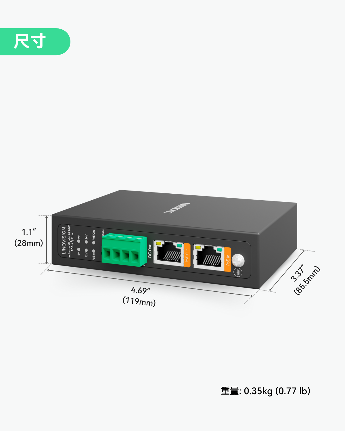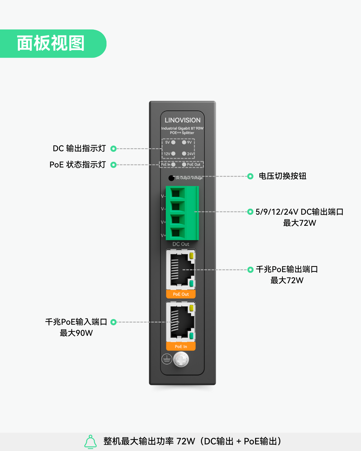 BT90W PoE分离器 - 将90W IEEE802.3bt PoE分离为IEEE802.3bt PoE输出和DC电源输出,总功率最大72W。IEEE802.3BT PoE输出 - 1个千兆IEEE802.3bt PoE输出端口。采用主动式 (Active) PoE技术,遵循PD受电设备检测 -> 分类 -> 供电的标准流程,防止标准PD设备受损,因此也支持连接非PoE设备。