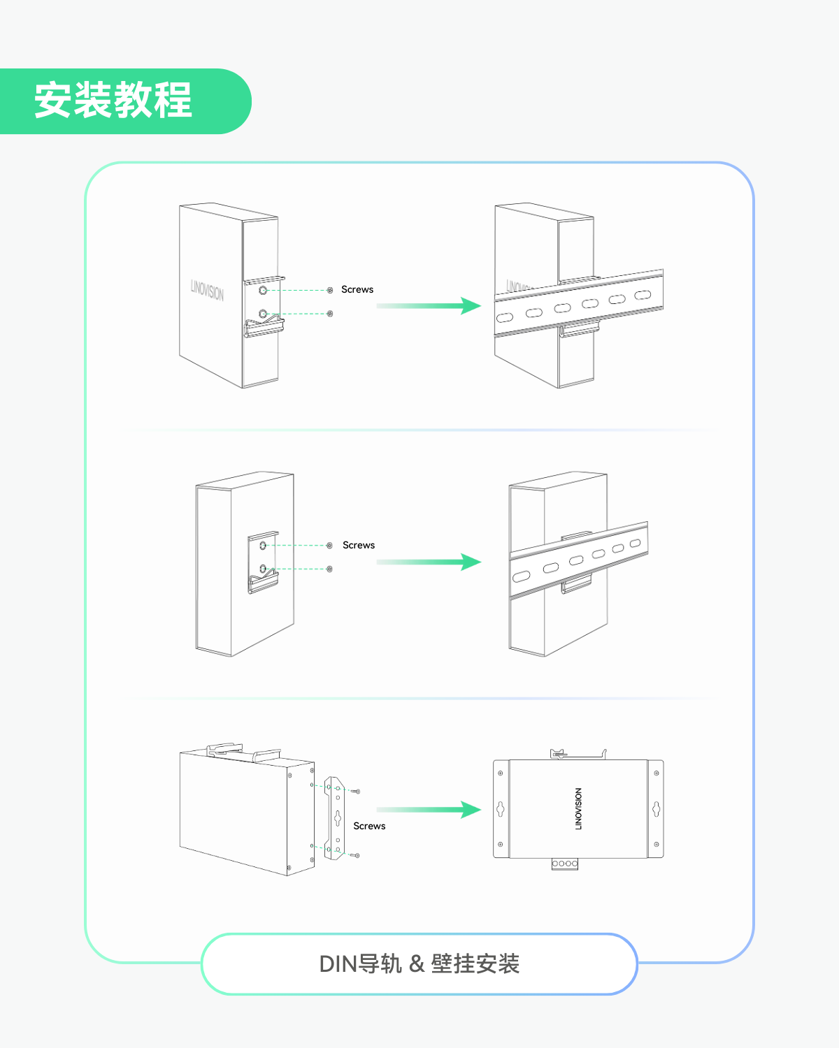 坚固设计 - 适用于恶劣环境,宽温工作范围-40℃ ~ 75℃(-40℉~167℉)。具备短路保护、热切断功能,DIN导轨安装。