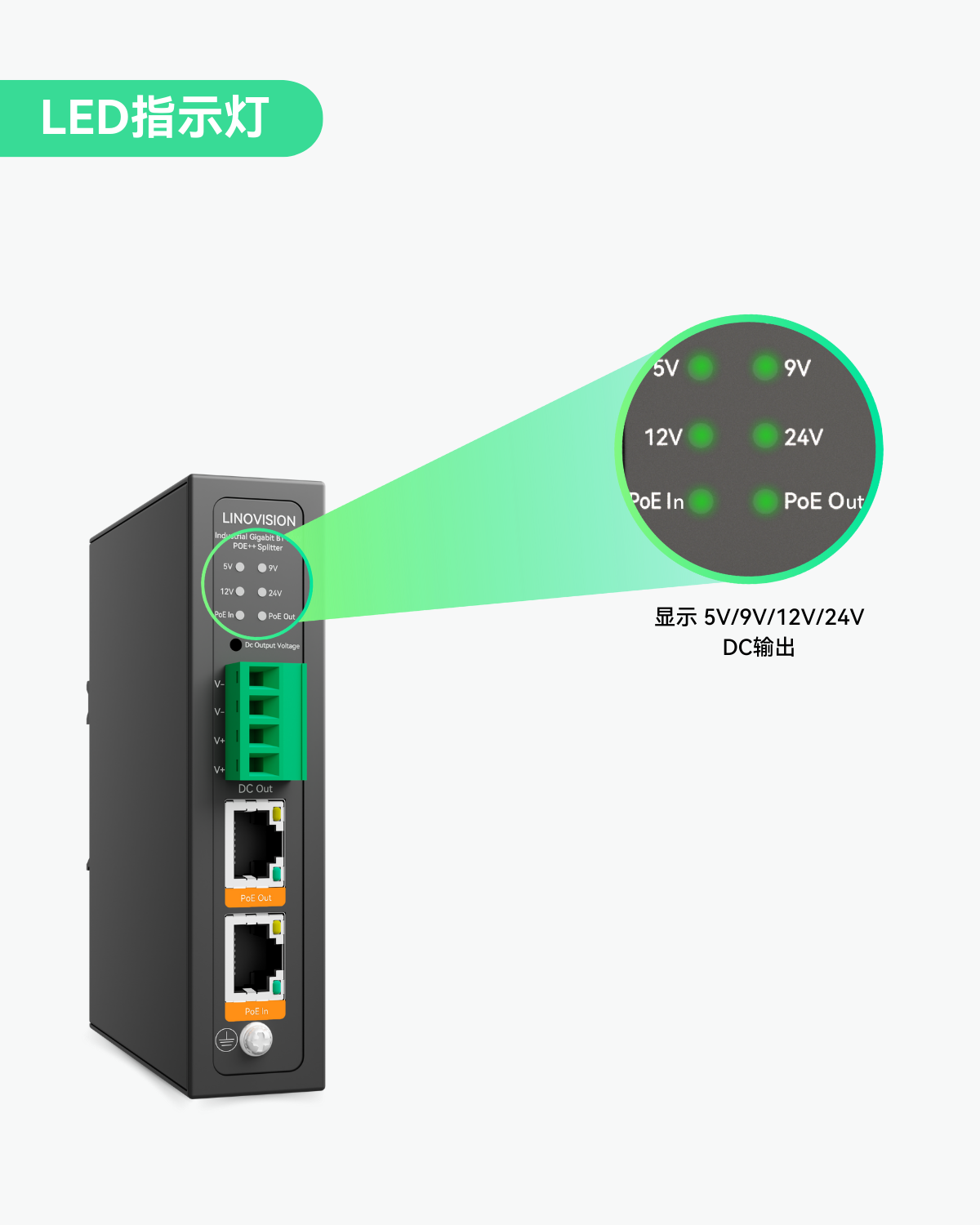 智能LED指示灯 - 显示5V/9V/12V/24V DC输出电压,高效控制输出功率。