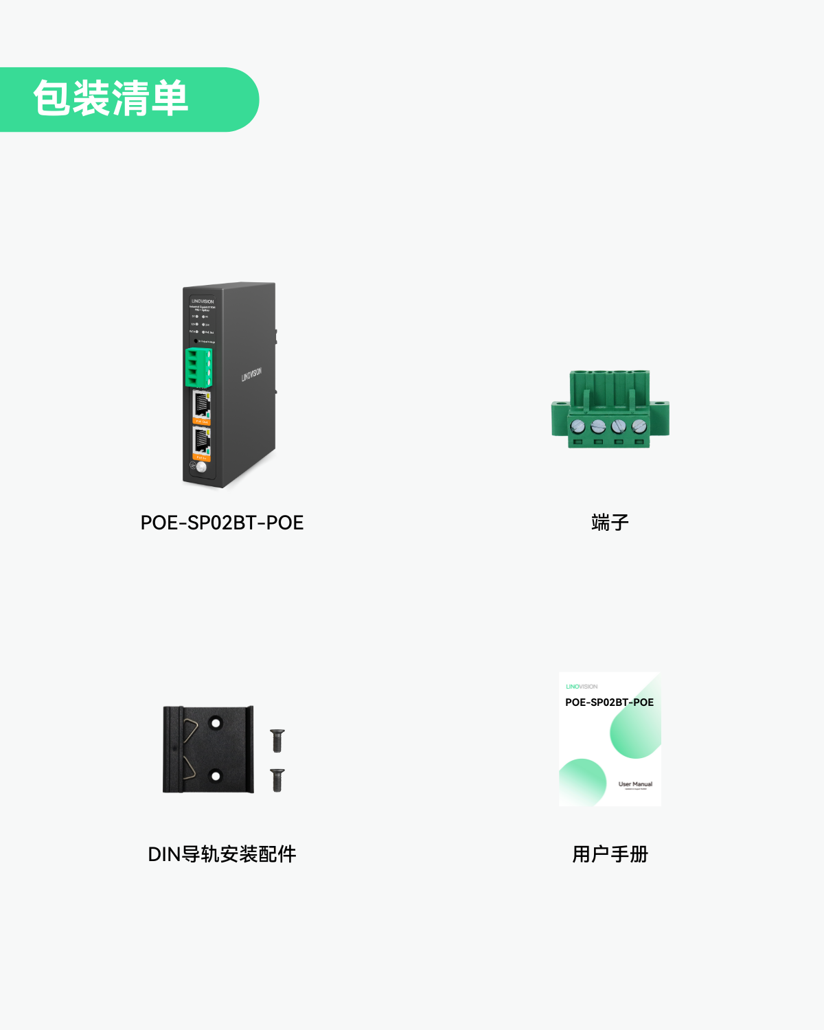 POE-SP02BT-POE需与标准的IEEE802.3bt/at PoE交换机/供电器配合使用,如POE-SW508G2和POE-IN9001。请勿将其与非标准的BT PoE交换机/供电器连接,包括POE-IN90W(非标Passive PoE版)。