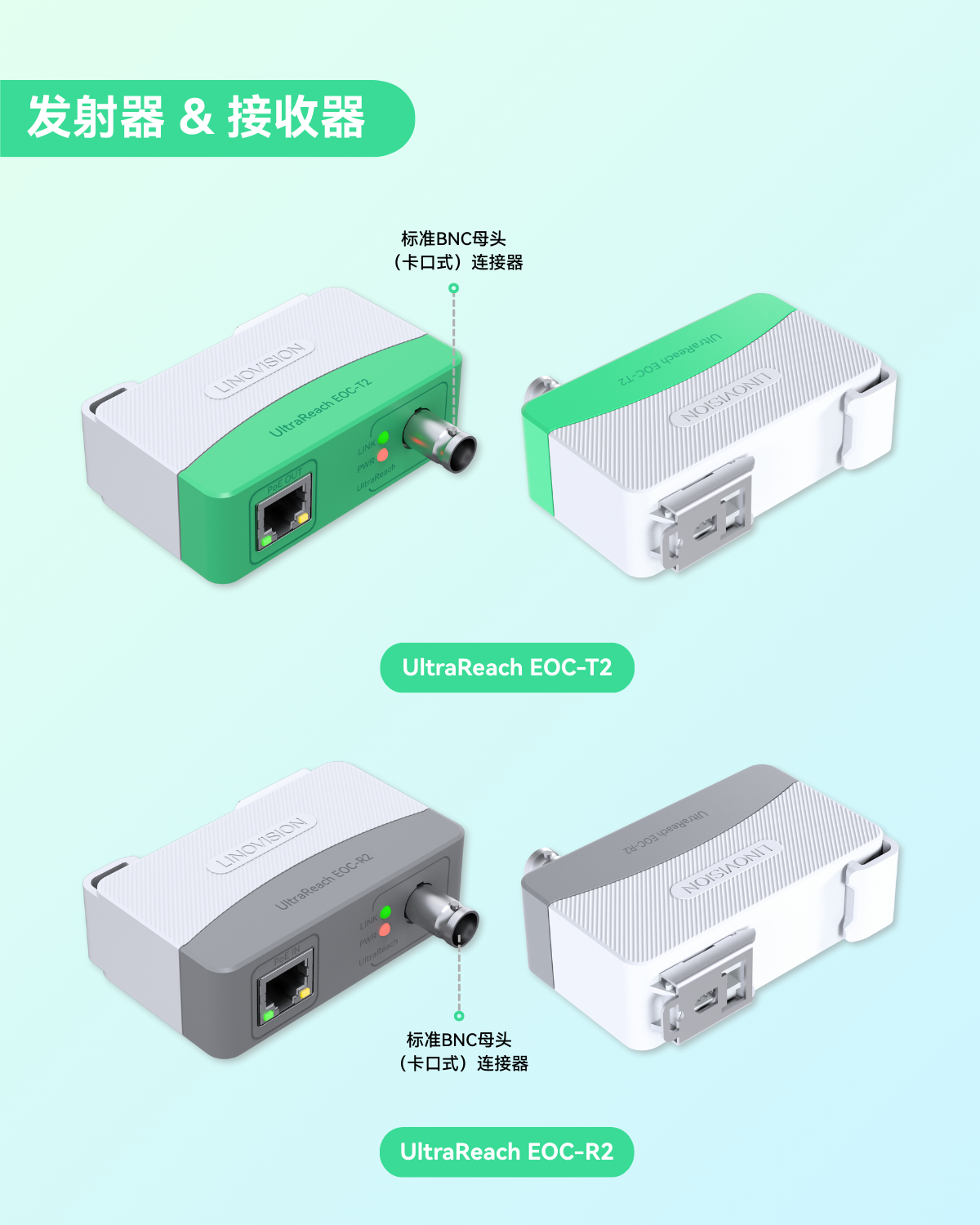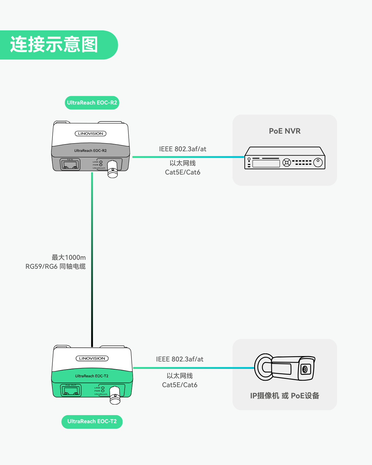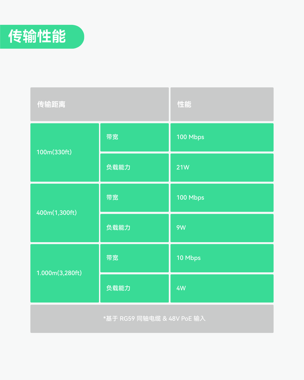 超长距离PoE传输,最长1000米 - 采用LINOVISION UltraReach技术,可通过同轴线或双绞线传输PoE电力和数据,最远距离达1000m (3300ft)。