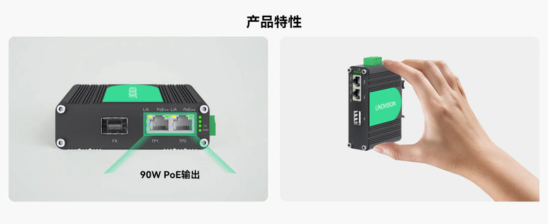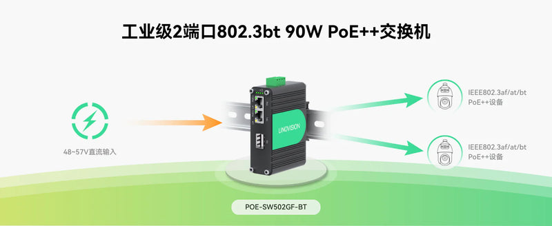 工业级双端口千兆BT90W PoE++交换机(带光纤SFP上行链路),支持IEEE802.3af/at/bt标准的迷你型PoE交换机
