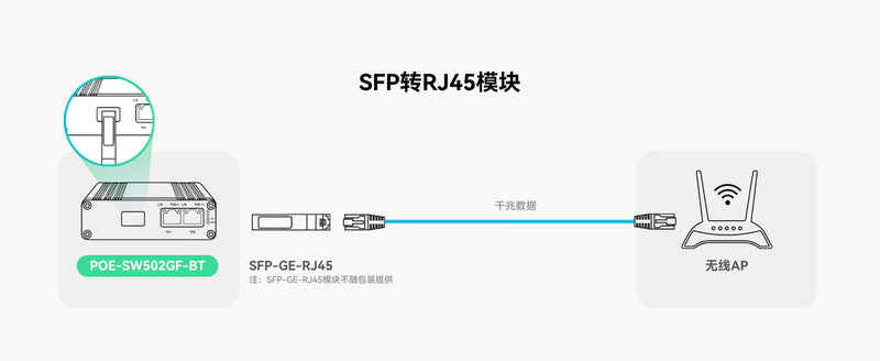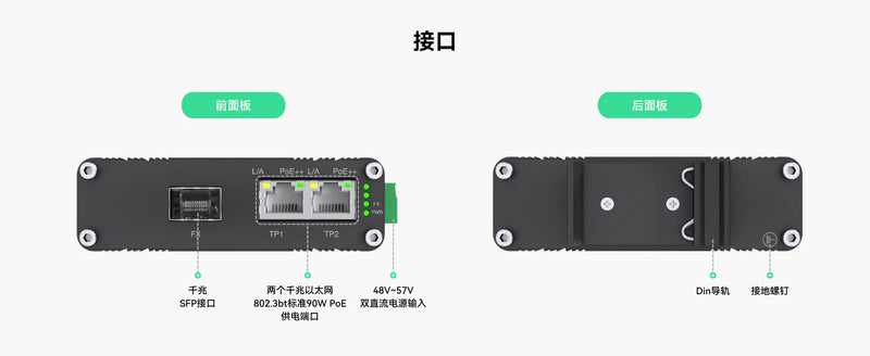 • 双端口PoE++交换机 - 提供两个千兆IEEE802.3af/at/bt PoE++端口,一个千兆SFP上行链路端口(可通过SFP-GE-RJ45模块将SFP端口转换为RJ45端口)