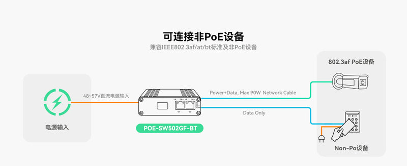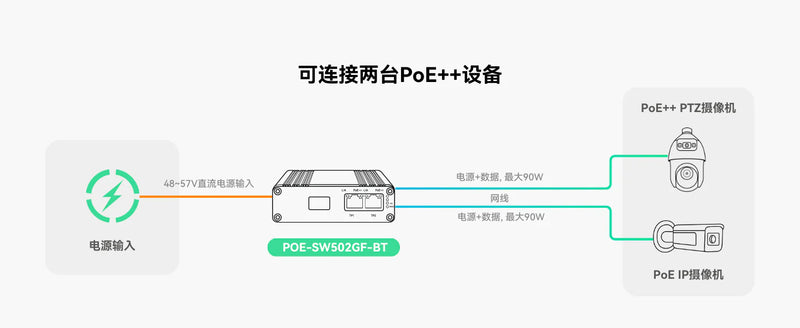 • BT 90W PoE输出 - 配备两个标准IEEE802.3bt 90W PoE++端口,适用于大功率PTZ摄像机及PoE照明设备,兼容IEEE802.3af/at标准及非PoE设备,总PoE功率预算180W