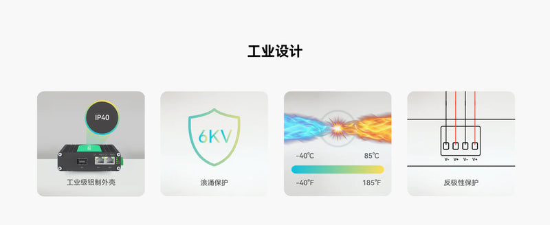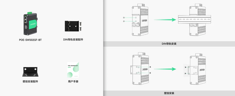 • 紧凑型设计 - 迷你PoE交换机尺寸为3.74″×3.13″×1.2″(95mm×79.4mm×30.5mm),支持DIN导轨或壁挂安装,可轻松部署于机柜或小型设备箱体