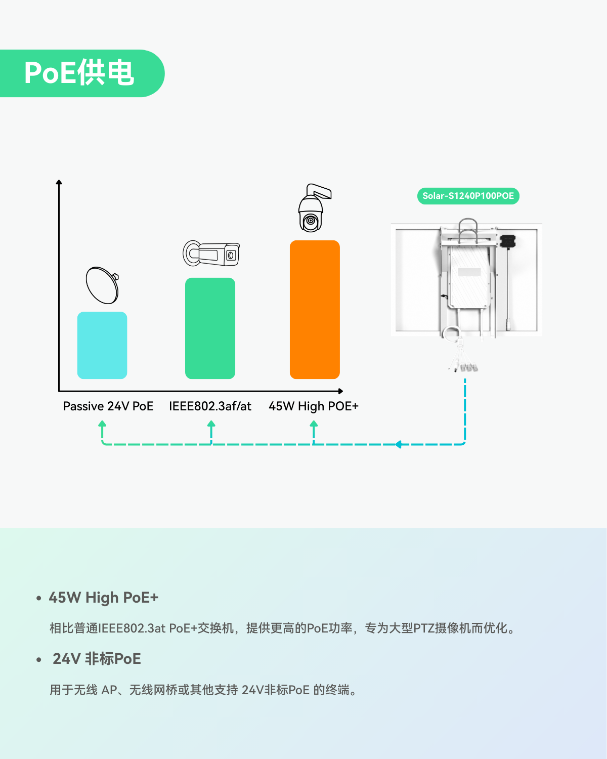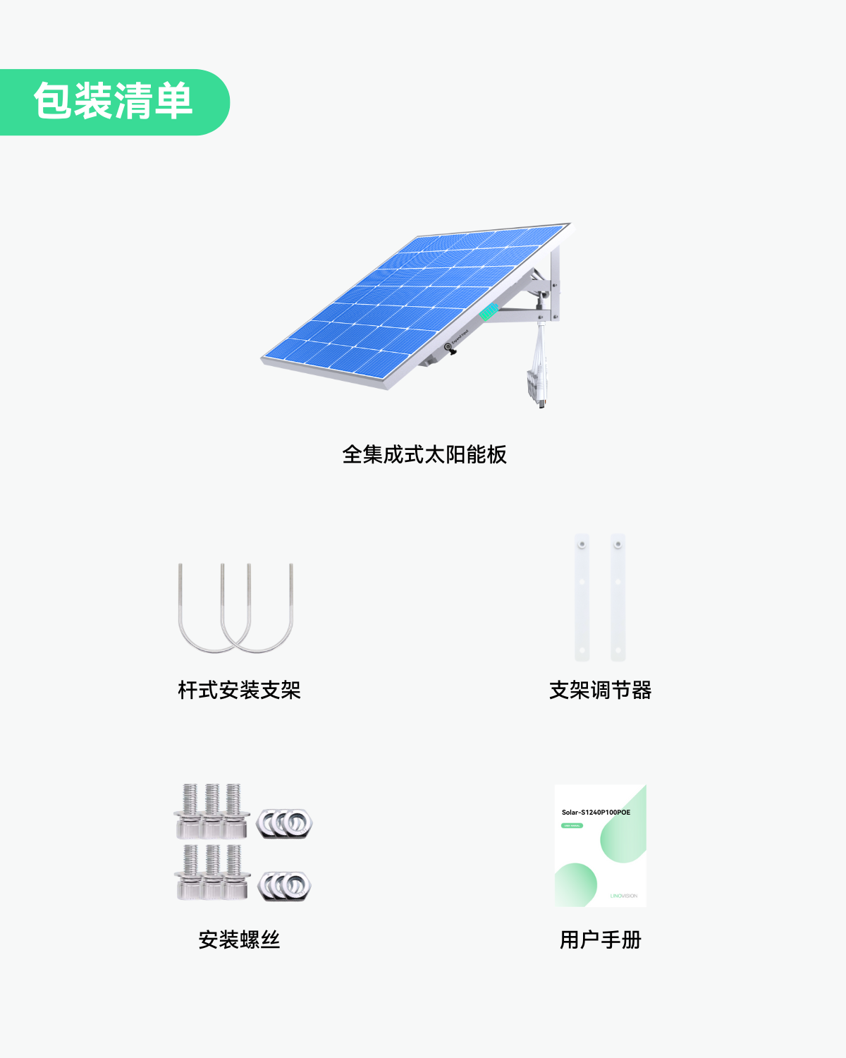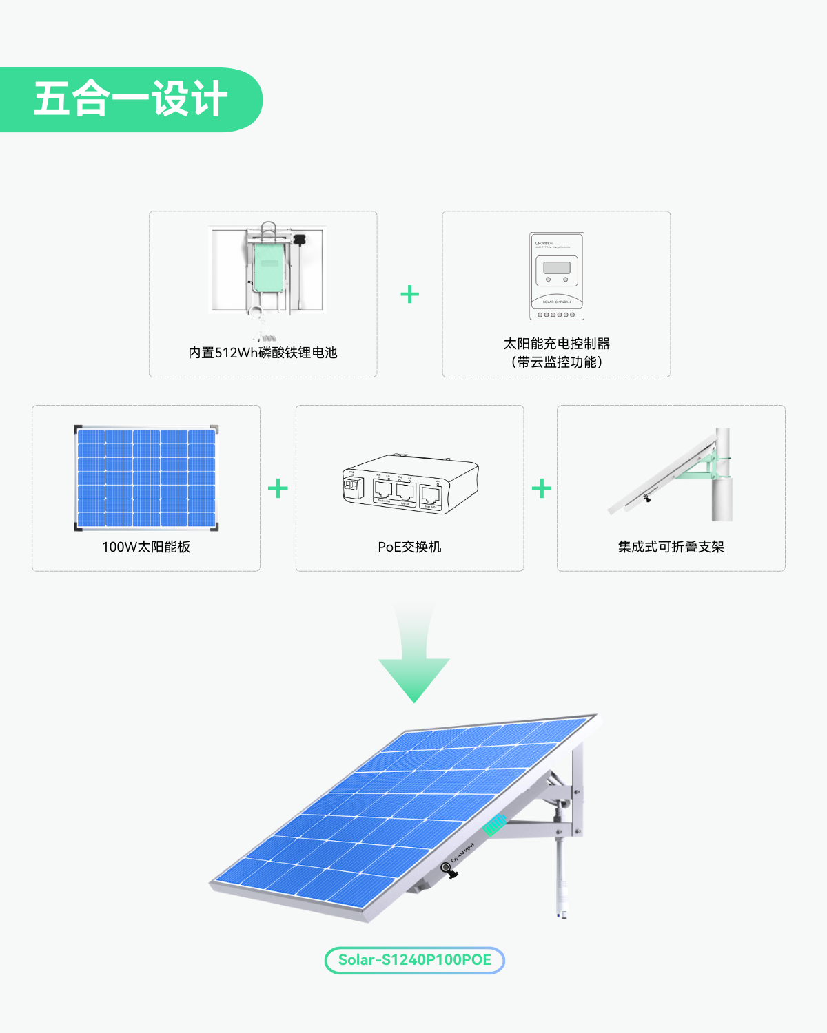 - 集成化设计 - 全集成的5合1设计(太阳能板、电池、充电控制器、PoE交换机和安装支架)