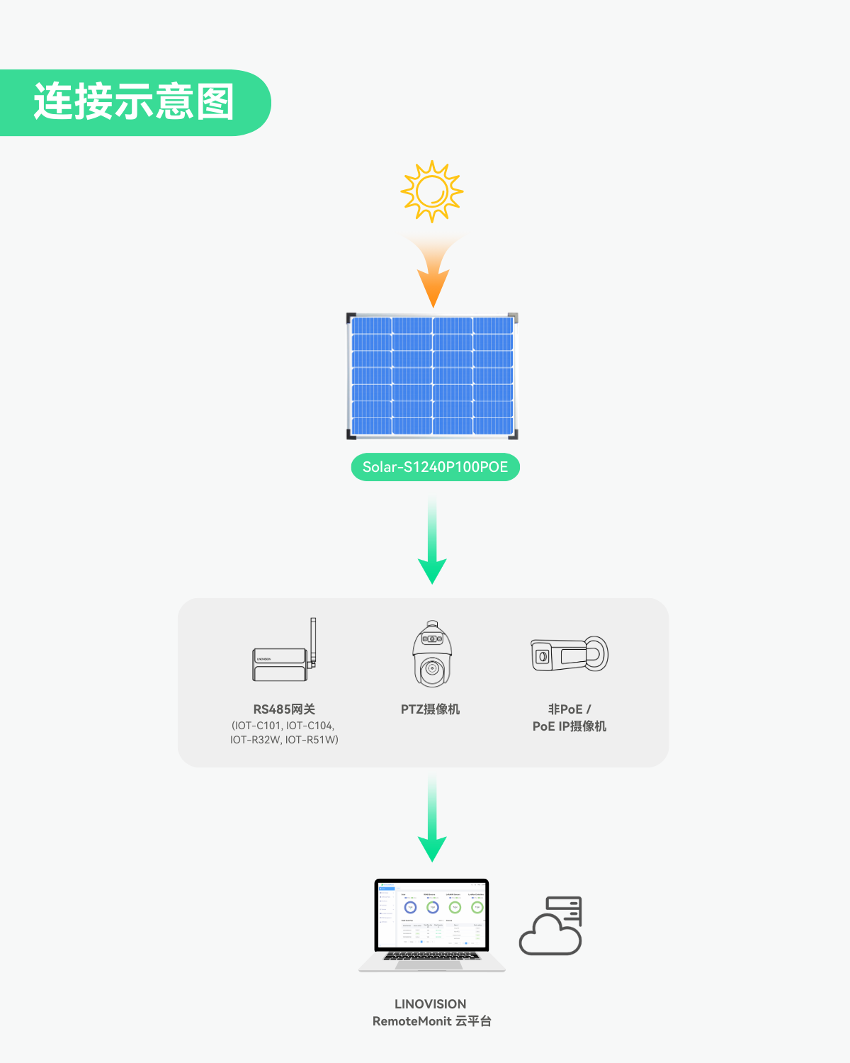 - 远程监控 - 当将SOLAR-S1240P100POE连接至RS485转TCP网关(如IOT-C101或IOT-R32W)时,可通过RS485接口进行远程充电状态监控
