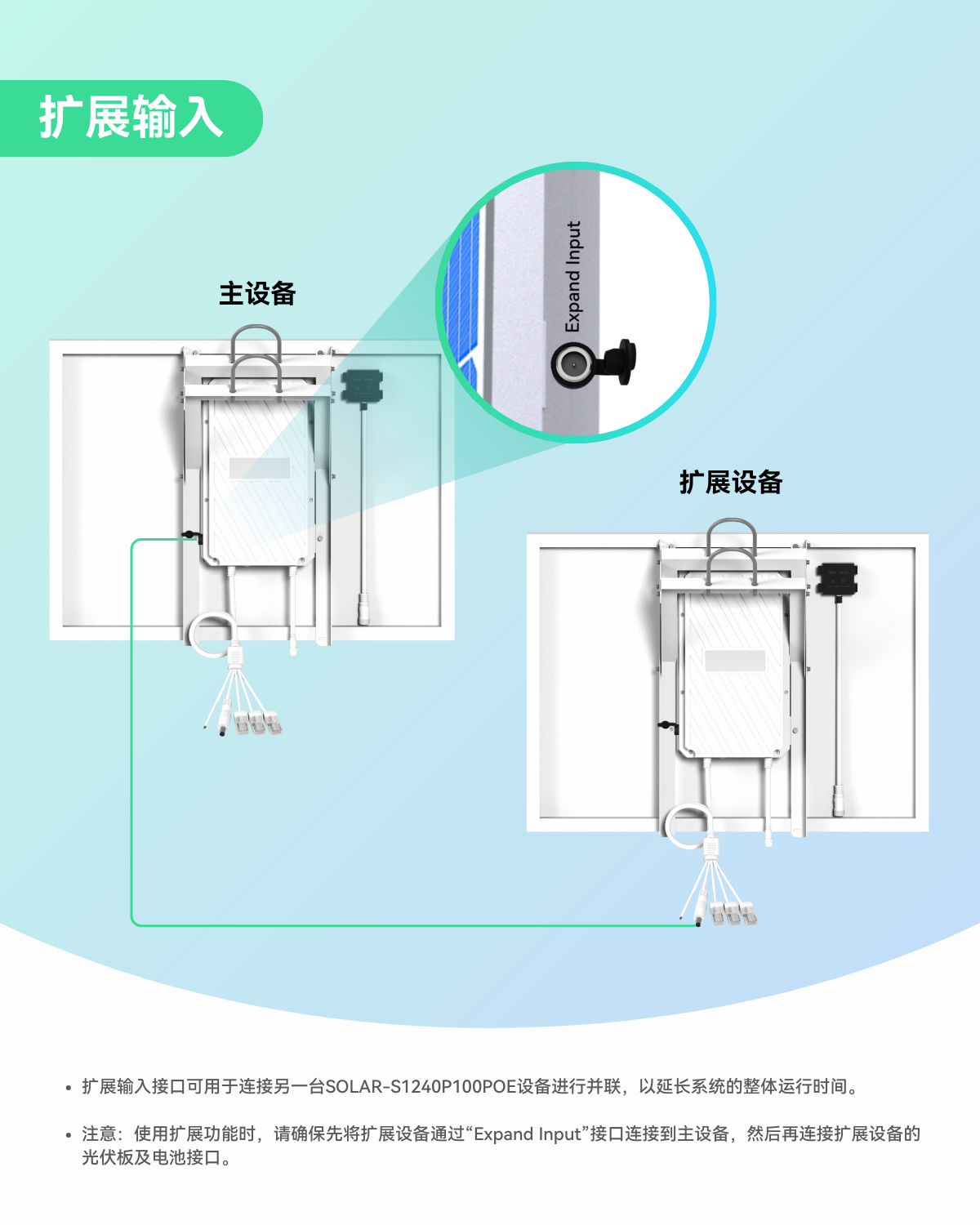 - 扩展输入端口 - 可用于并联连接另一台SOLAR-S1240P100POE设备,以延长系统整体运行时间