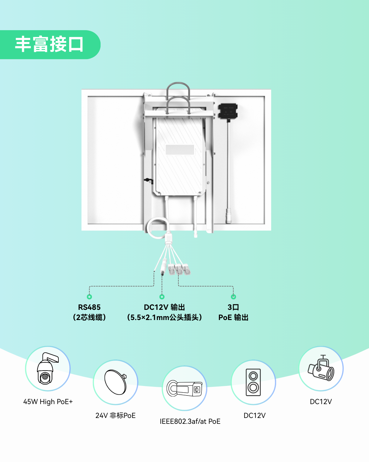 - 丰富接口 - 3口PoE输出、DC12V输出 (5.5×2.1mm公头插头)、RS485接口 (2芯线缆)